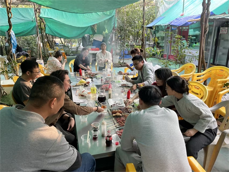 傍晚時分,平日里忙碌于案頭的同事們瞬間化身為“燒烤大師”。在裊裊炊煙中,大家品嘗著自己親手制作的美食,暢談工作與生活,歡聲笑語伴隨著食物的香氣彌漫在整個營地,工作中的壓力在此刻得到了徹底的釋放。