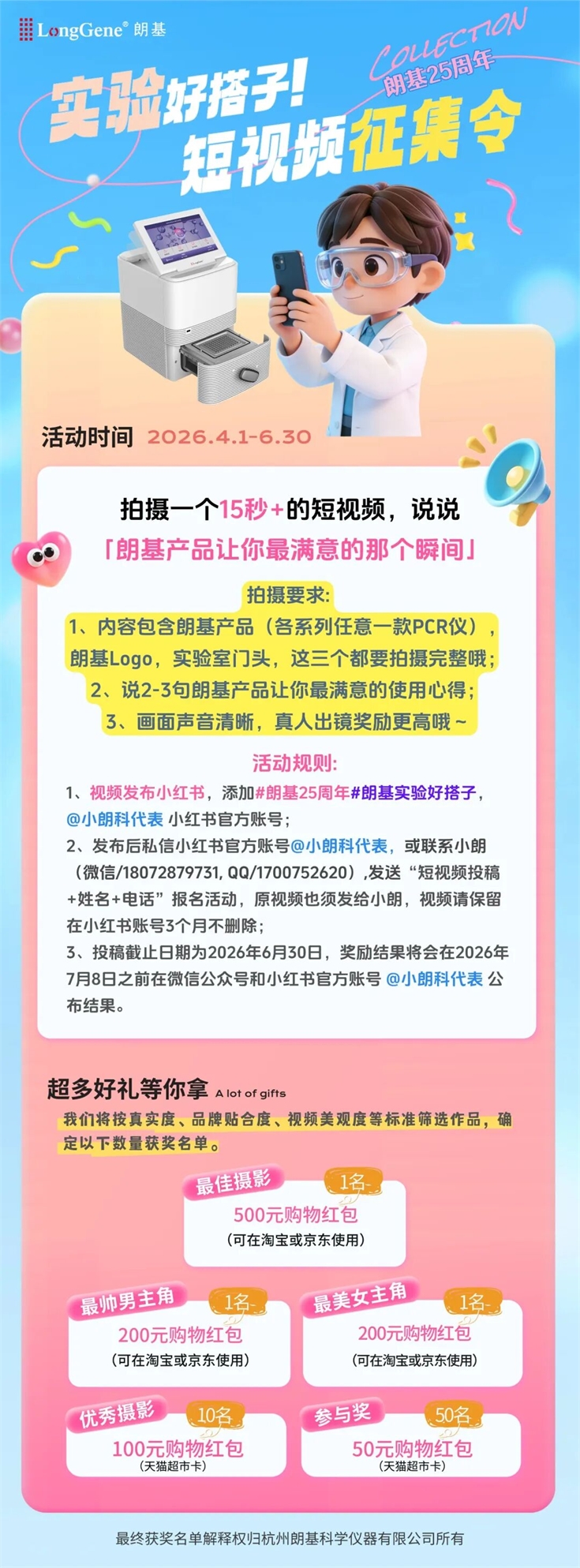 為了慶祝這個特別的時刻,朗基發起了 “朗基25周年·實驗好搭子”短視頻征集令。而作為廣東總代,我們決定:凡是廣東省的用戶參與活動,我們再加碼送好禮! 讓大家的參與感加倍,快樂也加倍!