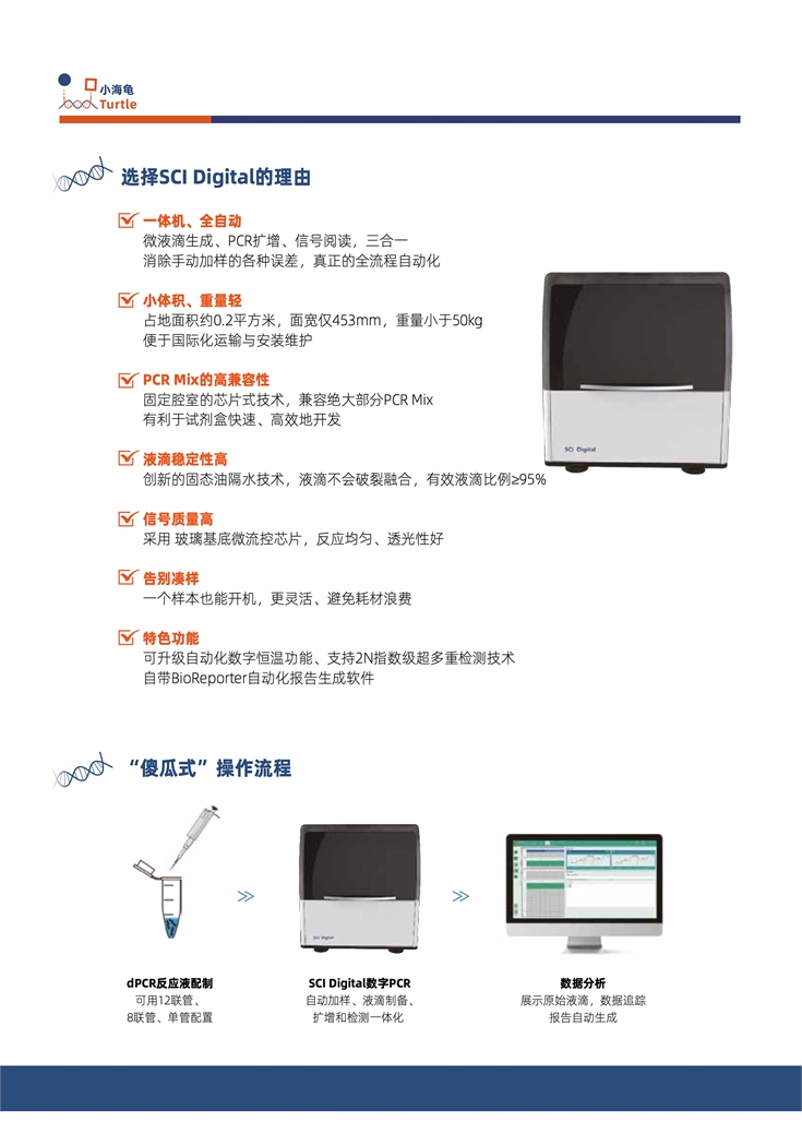 SCI Digital數(shù)宇PCR?體機具備:一體機、全自動,小體積、重量輕,PCR Mix的高兼容性,液滴穩(wěn)定性高,信號質(zhì)量高,告別湊樣等優(yōu)點。
