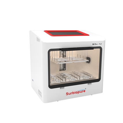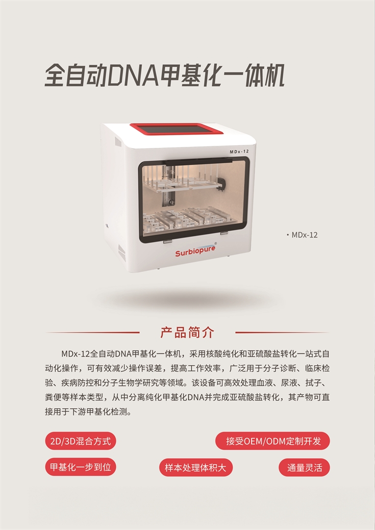 MDx-12全自動(dòng)DNA甲基化一體機(jī),采用核酸純化和亞硫酸鹽轉(zhuǎn)化一站式自動(dòng)化操作,可有效減少操作誤差,提高工作效率,廣泛用于分子診斷、臨床檢驗(yàn)、疾病防控和分子生物學(xué)研究等領(lǐng)域。該設(shè)備可高效處理血液、尿液、拭子、糞便等樣本類型,從中分離純化甲基化DNA并完成亞硫酸鹽轉(zhuǎn)化,其產(chǎn)物可直接用于下游甲基化檢測(cè)。