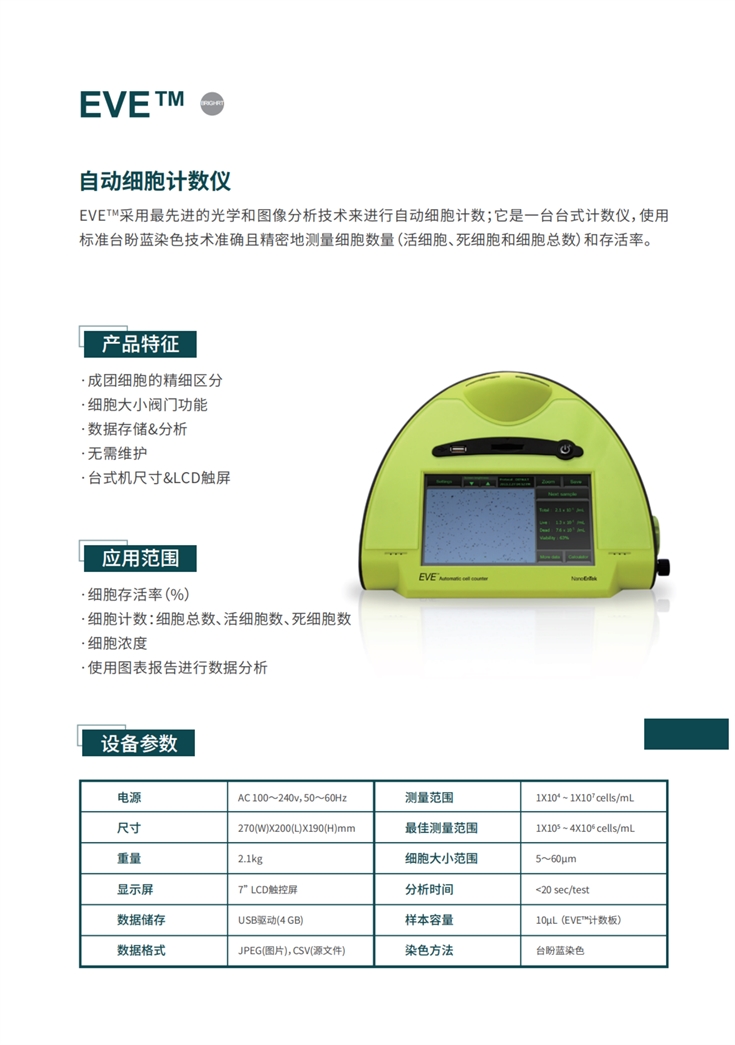 EVE?采用最先進(jìn)的光學(xué)和圖像分析技術(shù)來進(jìn)行自動細(xì)胞計數(shù);它是一臺臺式計數(shù)儀,使用標(biāo)準(zhǔn)臺盼藍(lán)染色技術(shù)準(zhǔn)確且精密地測量細(xì)胞數(shù)量(活細(xì)胞、死細(xì)胞和細(xì)胞總數(shù)) 和存活率。