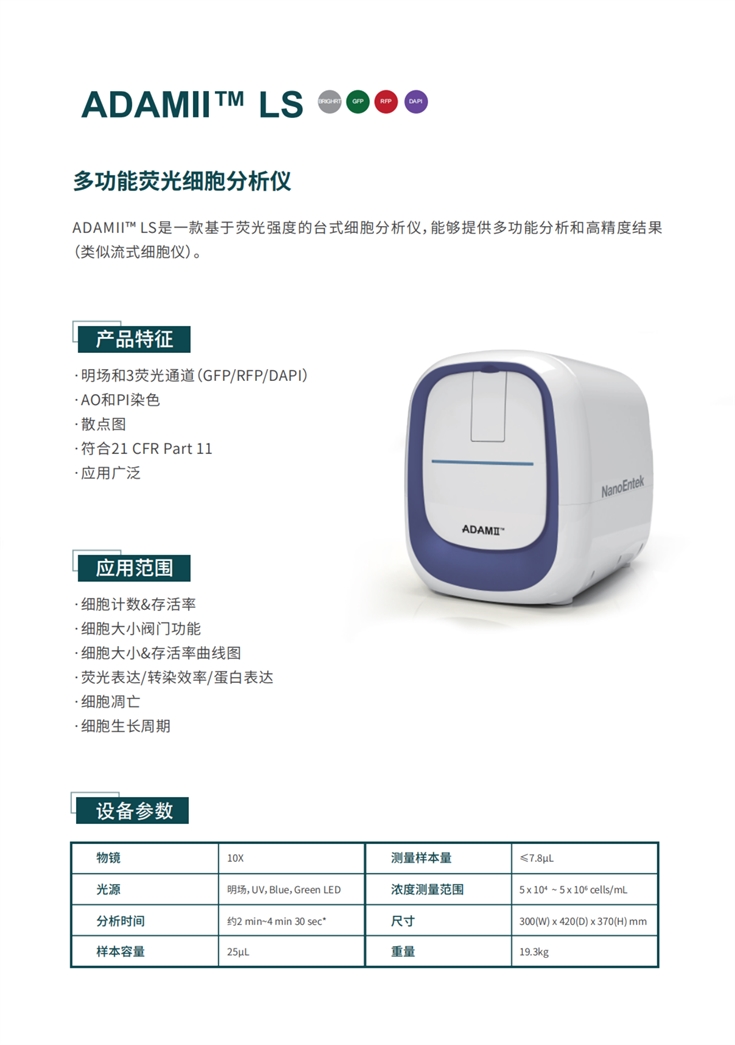 產(chǎn)品型號(hào):ADAMII?LS多功能熒光細(xì)胞分析儀