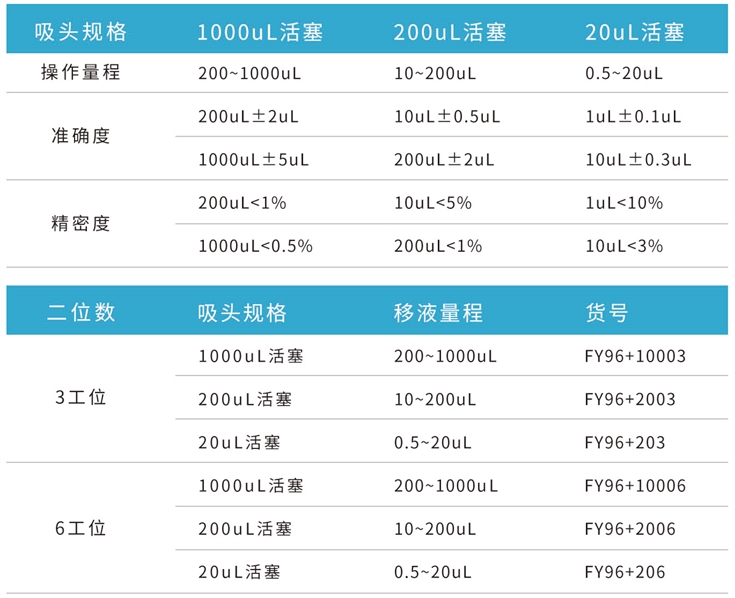 Surbiopure-FY96全自動樣品處理系統提供3種不同量程的移液模塊,供用戶根據需要進行選擇更換,以下為各移液模塊相關參數。
