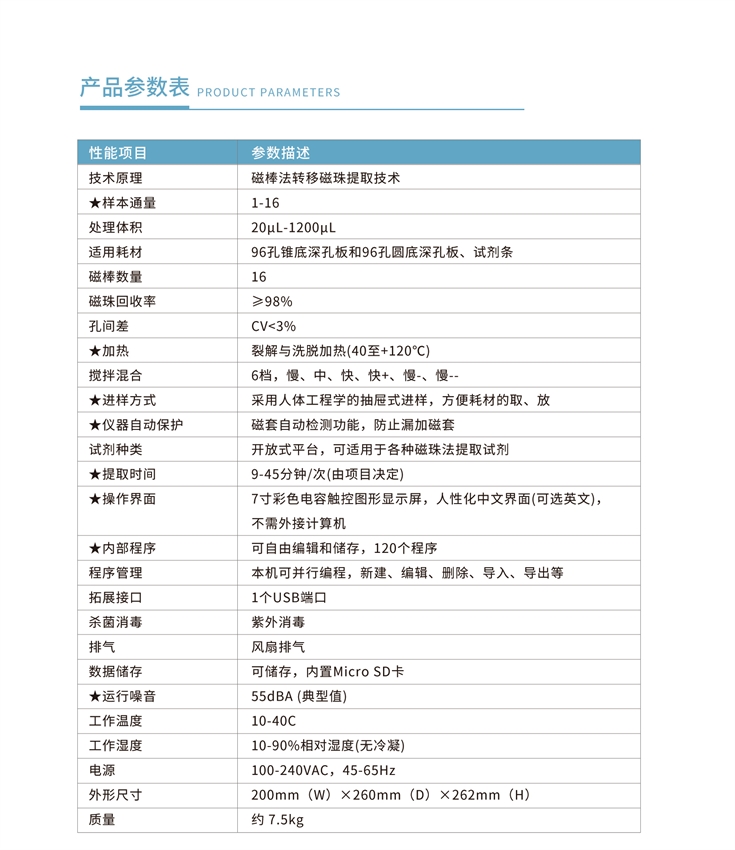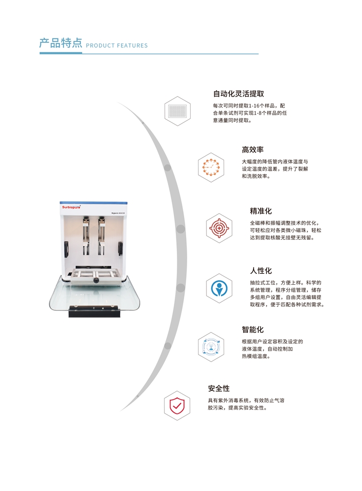 MyPure-Mini16全自動核酸提取儀采用磁珠分離技術,利用2.2ml深孔板、2.2ml試劑條、8聯磁棒套;搭配不同種類的磁珠法核酸提取試劑盒,最多可一次同時操作1-16個樣本,儀需9~45分鐘就可快速提取樣本中的DNA和RNA。 本系統通量靈活,可實現不同需求量的樣品提取,使用范圍廣;每次可同時提取1-16個樣品,配合單條試劑可實現1-8個樣品的任意通量同時提取;搭載7寸彩色觸控一體化操作界面,可自由編輯提取程序;配置負壓排氣系統和紫外燈消毒系統,避免氣溶膠污染,安全可靠;尤其適合零散樣本的現場核酸提取,配合實時熒光定量PCR系統,可輕松實現戶外現場樣本的即時檢測。