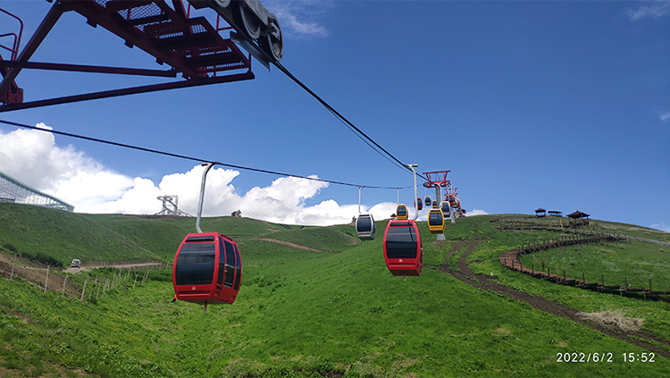 固定抱索器吊廂索道具有方便、高性價比等特點。吊箱采用封閉式,常用配置選擇2人吊箱、4人吊廂。其工作原理是一條閉合的運載索套在索道兩端的驅動輪及迂回輪上,線路中間設有支架,支架上裝有托索輪或壓索輪組,隨地形變化將運載索托起或壓下,按一定間距將吊廂用抱索器固結在運載鋼索上,動力驅動輪帶動載索,迂回輪實現(xiàn)線路往返來實現(xiàn)運送乘客的目的。2人廂和4人廂索道是景區(qū)觀光交通的性價比高的理想產(chǎn)品,索道的建設和維護成本相對較低。適合旅游開發(fā)投資前期。固定抱索器的2廂和4人廂索道線路速度和站內速度相對一致,線速度可站內控制變頻調速。根據(jù)廂配置,2人廂線路速度可達1米/秒,4人廂的線路速度可達0.8米/秒,乘客乘坐須站內工作人員手動開關門廂門。2人廂和4人廂的選擇,可根據(jù)不同的線路和高差來配置廂的運量和個數(shù),以滿足客戶運營者和使用者的需求。